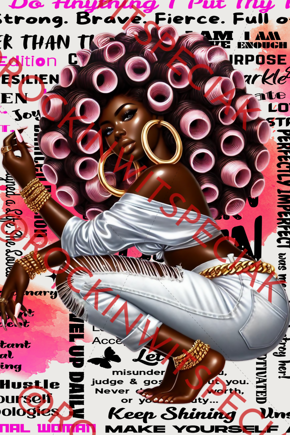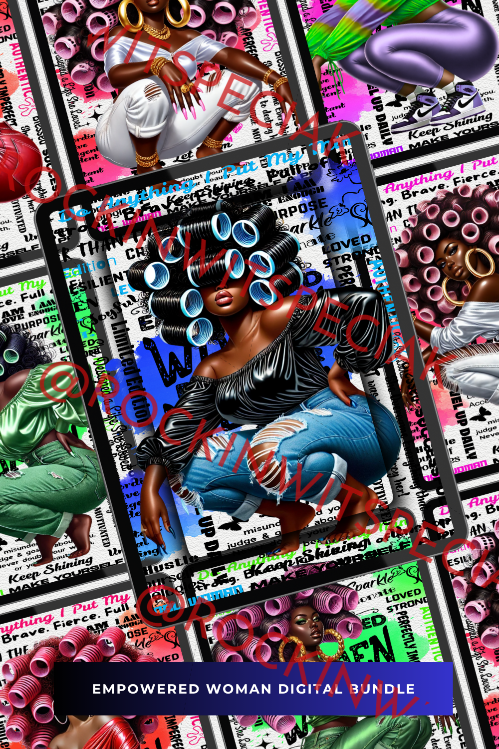 This digital bundle features 5 bold and beautiful Black girl character illustrations — each crowned in curlers, glowing with confidence, and ready to level up your next creative project.PLEASE NOTE: This listing includes character PNGs ONLY — no tumbler wraps, templates, or printables included. These files are transparent background clipart, perfect for digital design projects.